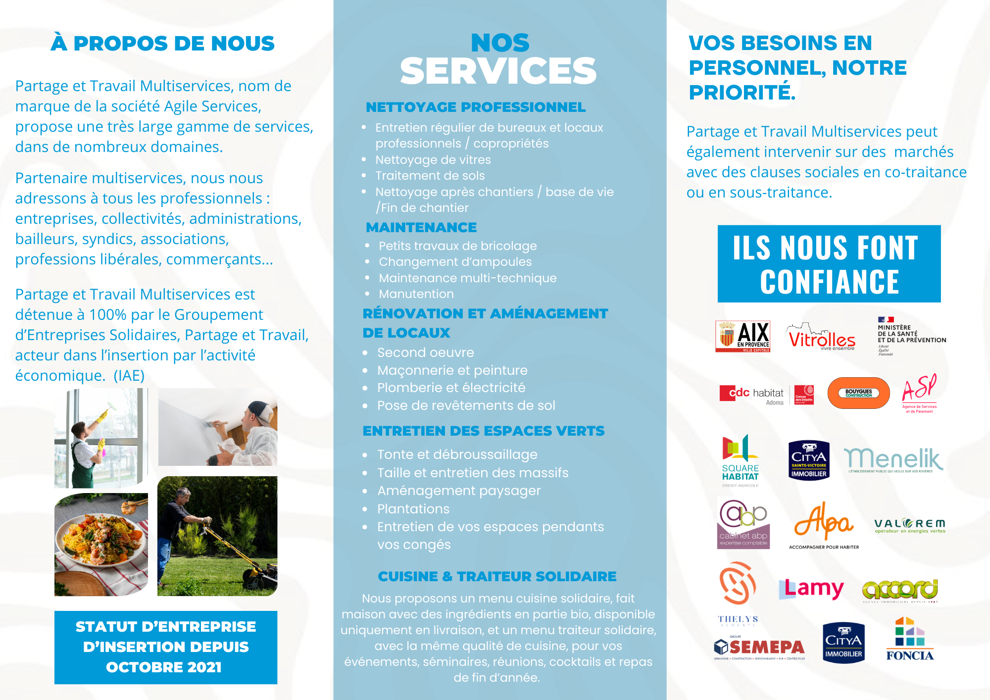 Partage et Travail Multiservices est détenue à 100% par le Groupe Partage et Travail, acteur dans le domaine de l’insertion professionnelle et du service à la personne sur le territoire du pays d’Aix.